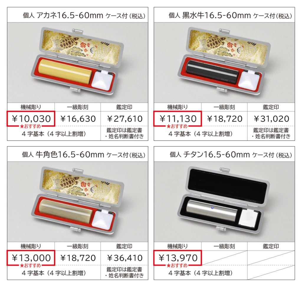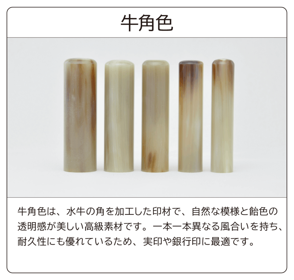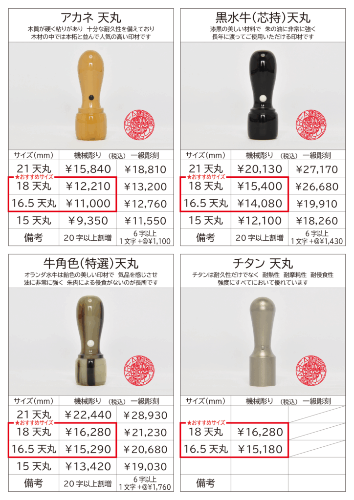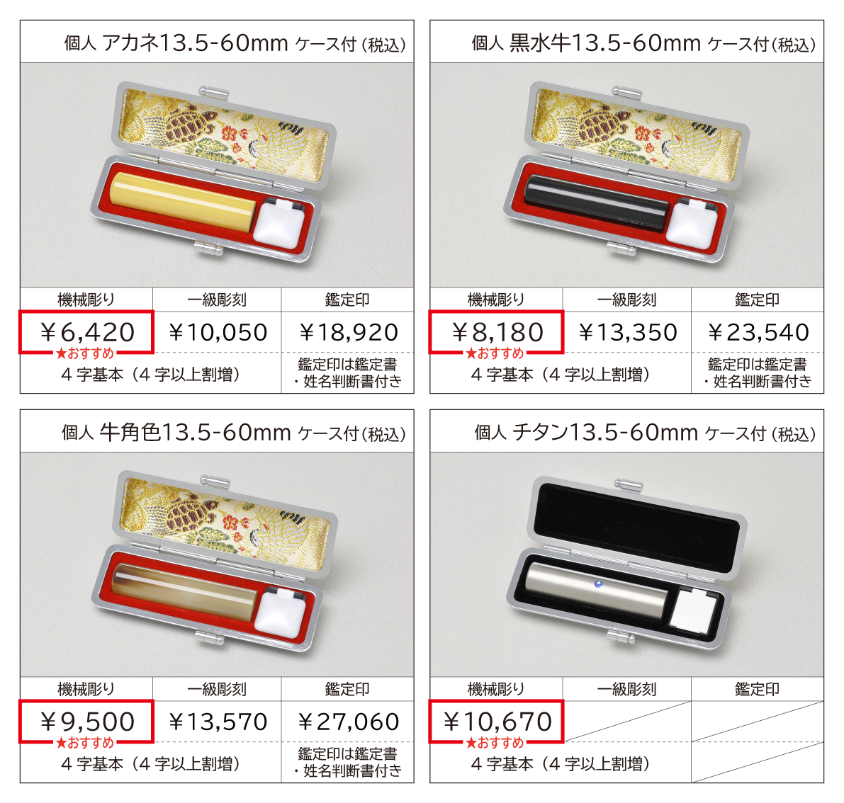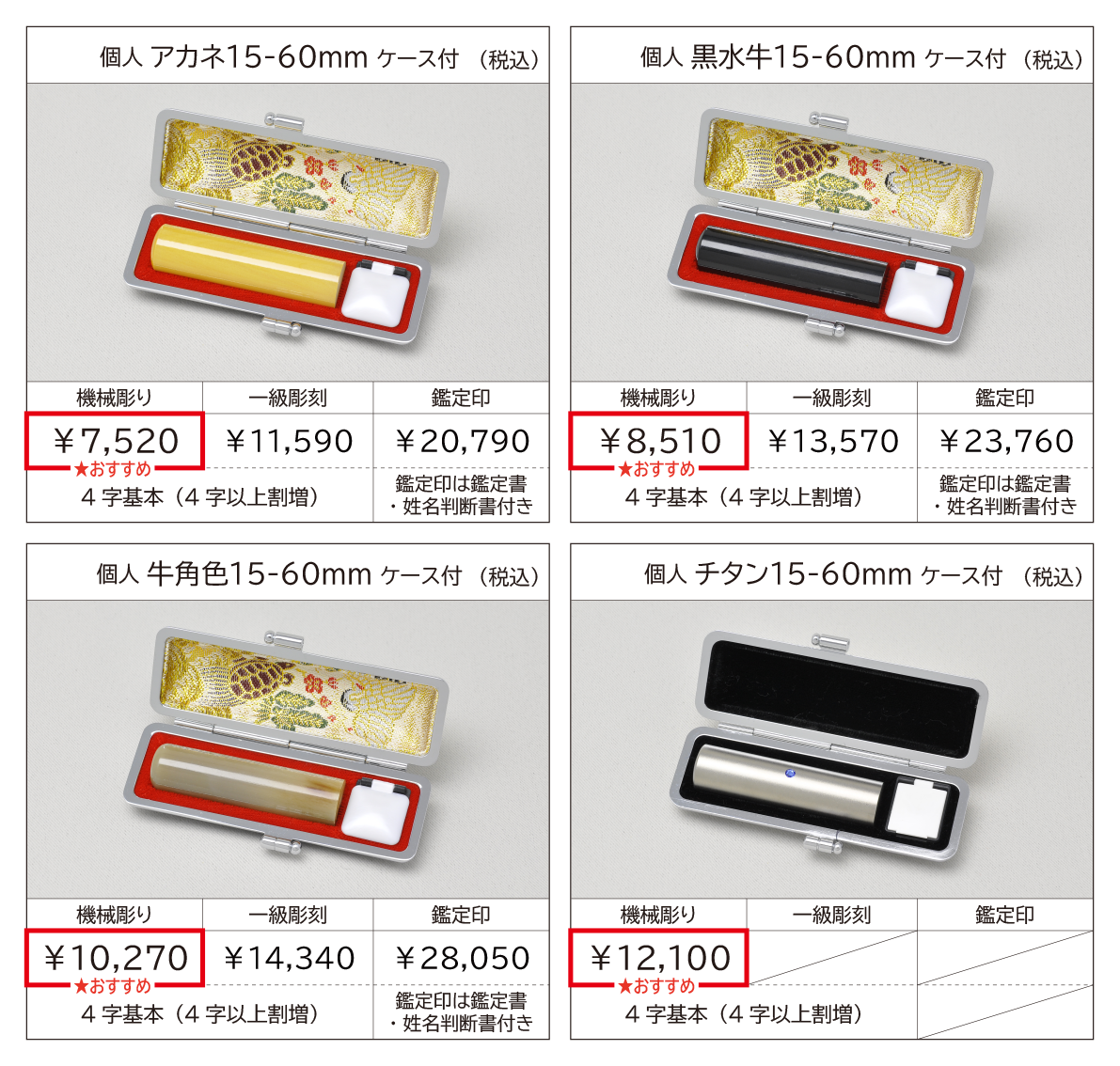 印材は主に,アカネ,黒水牛,牛角色,チタンの