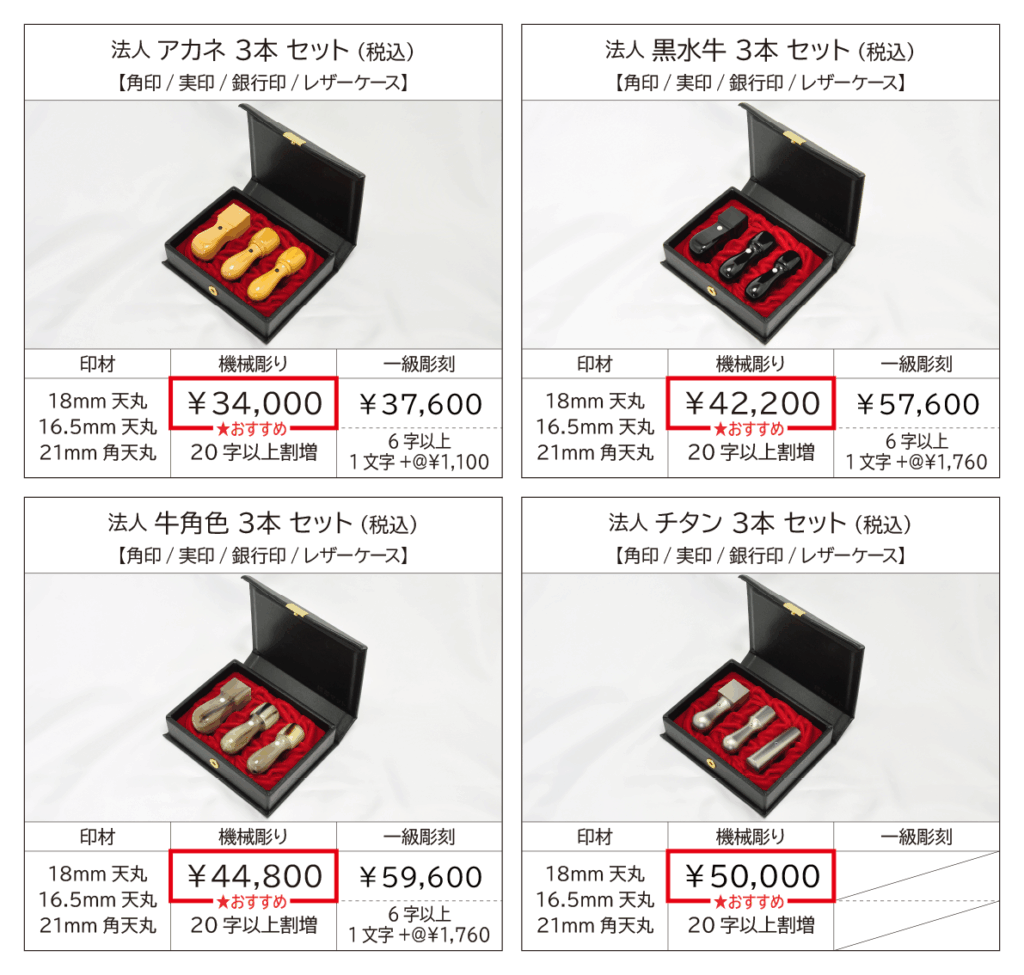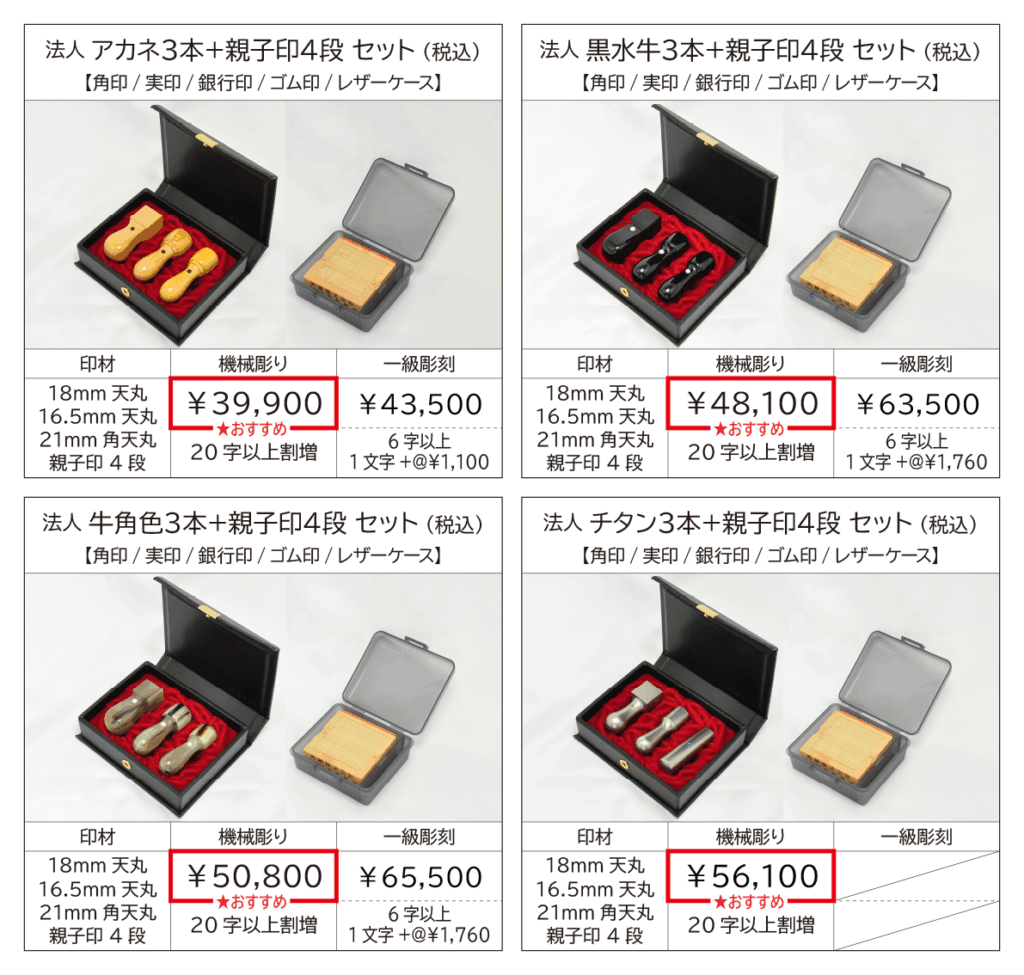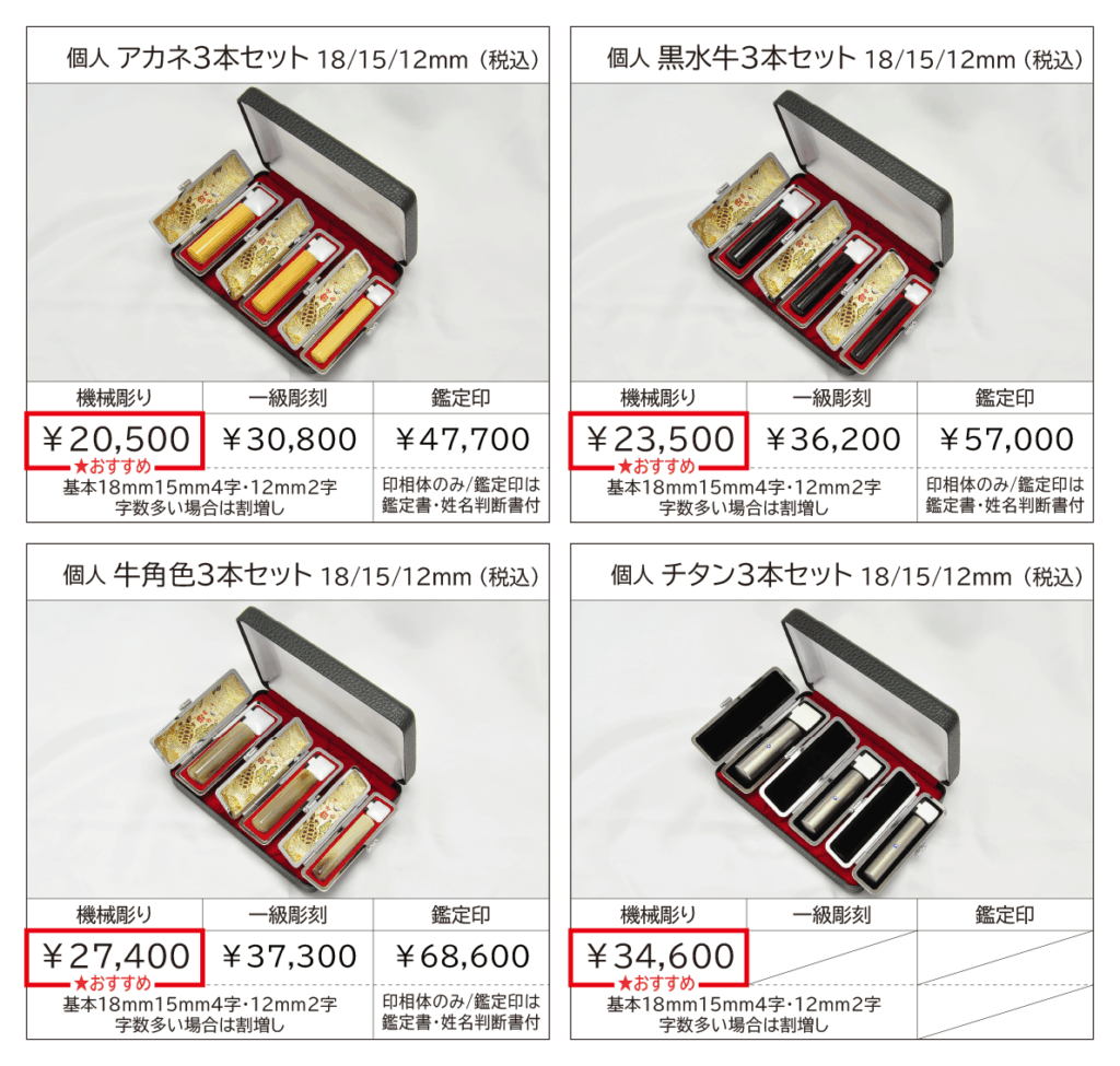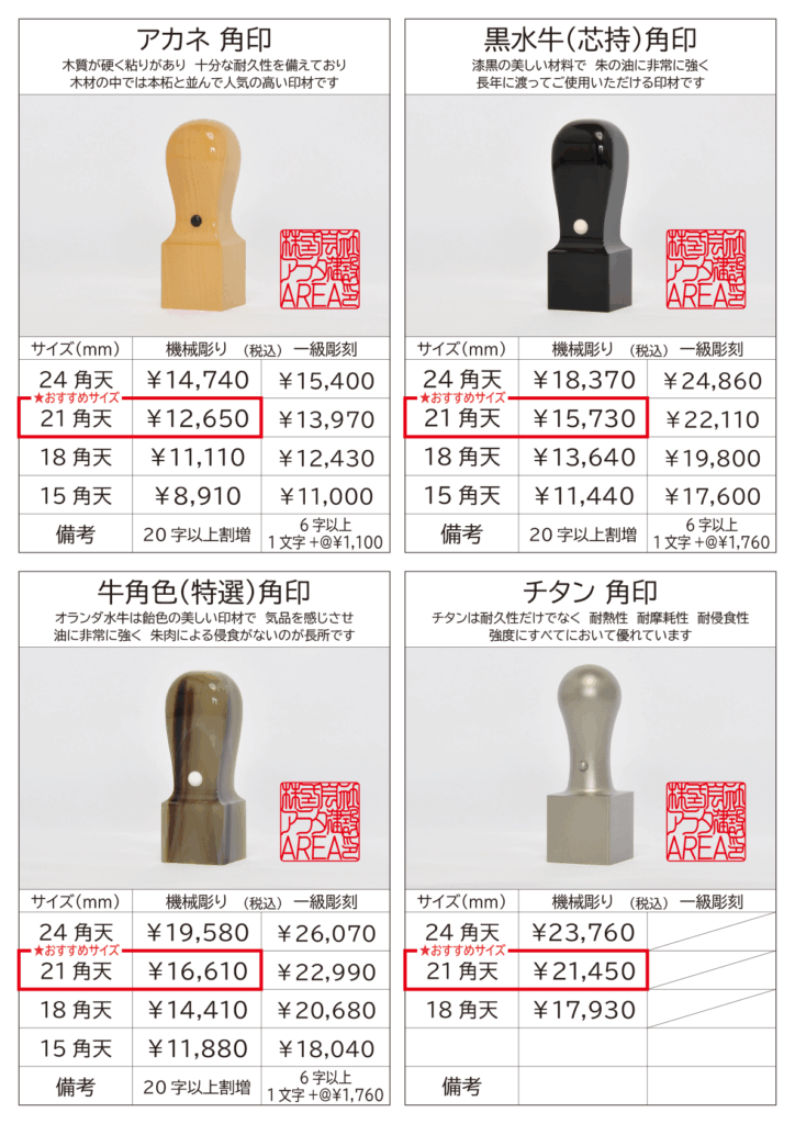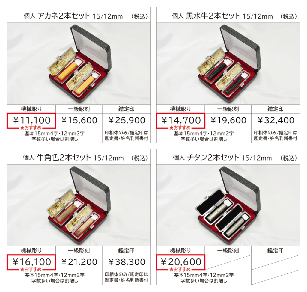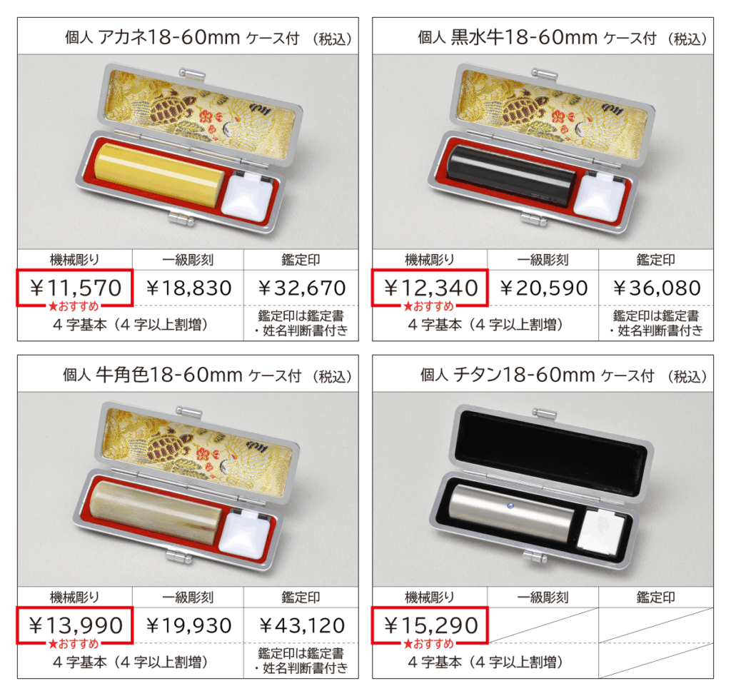 印材は主に,アカネ,黒水牛,牛角色,チタンの