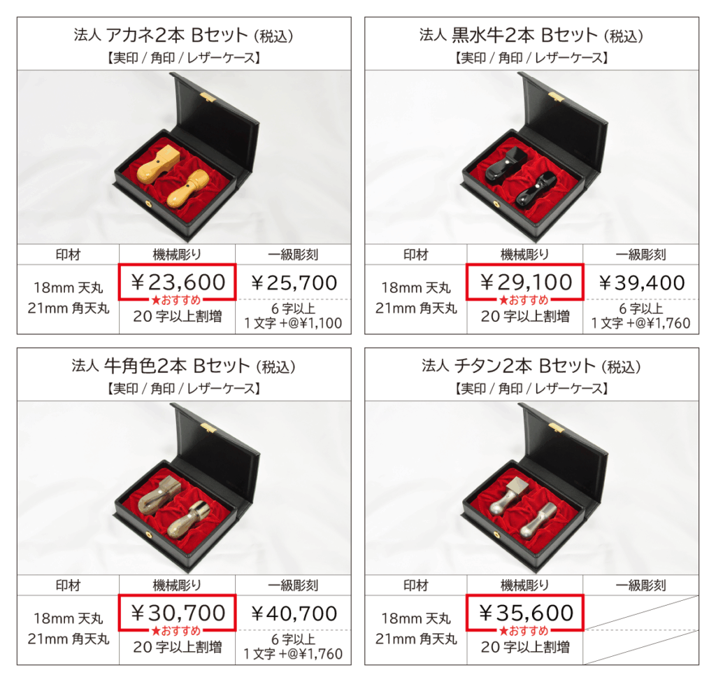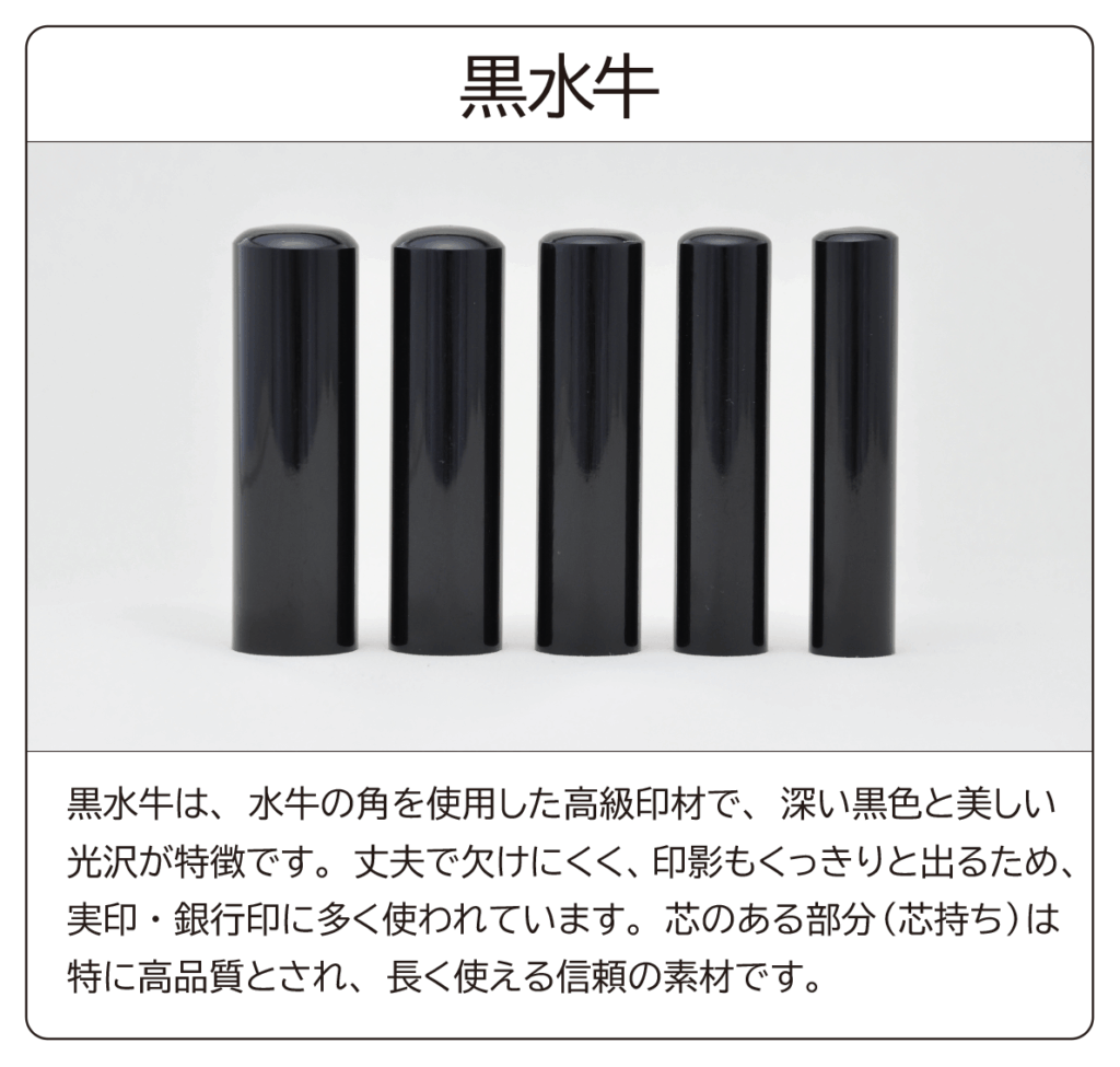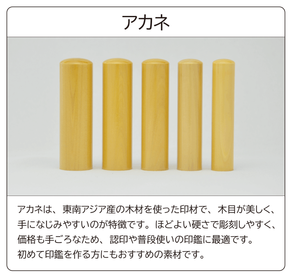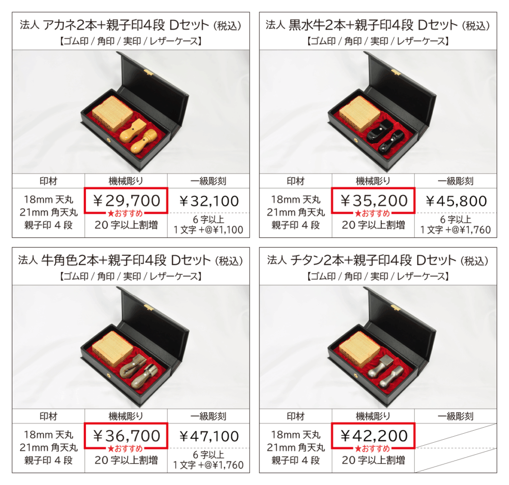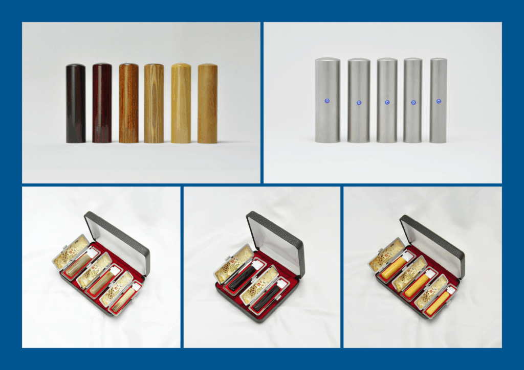 印材は主に,アカネ,黒水牛,牛角色,チタンの