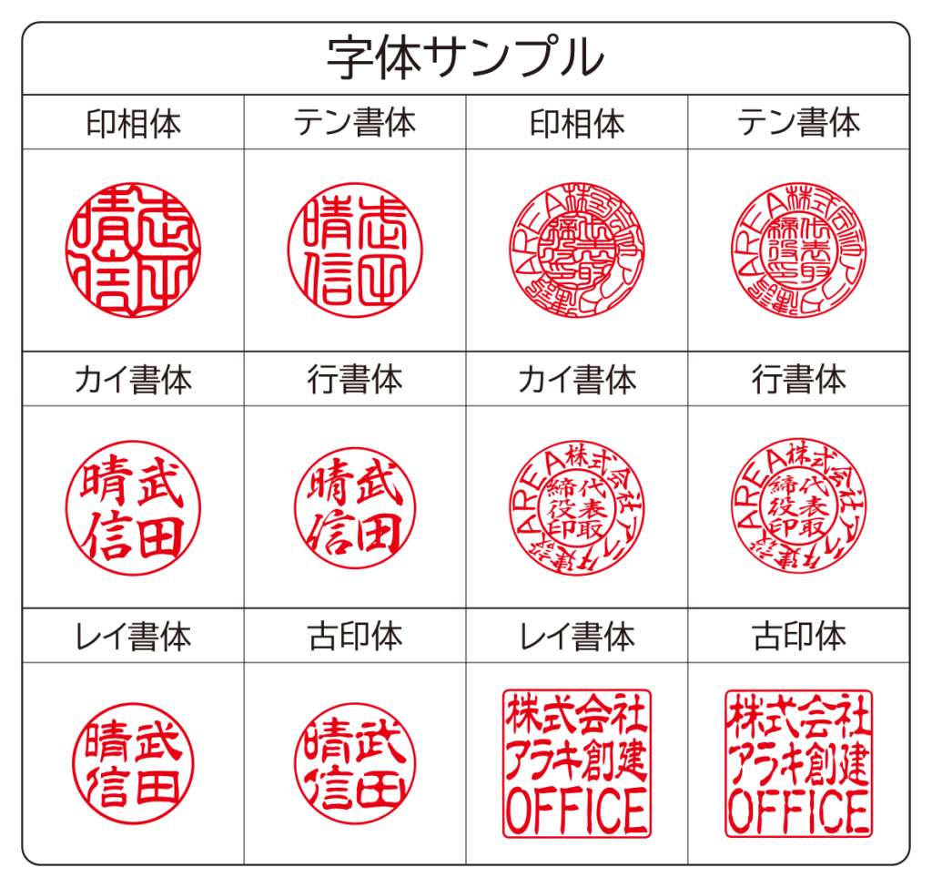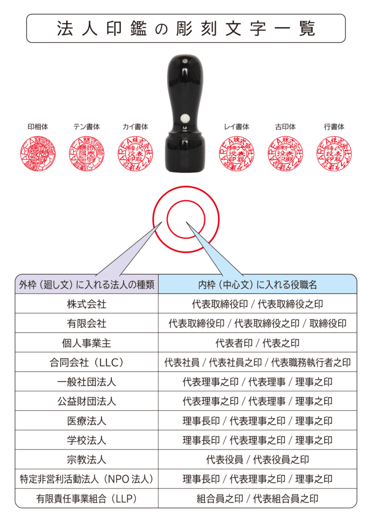 会社印の外枠(廻し文)と内枠(中心文)の案内です